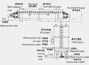 La placa de prensado continuo alimenta el material a la capa superior de secado, donde la mezcla es agitada por los rastrillos del brazo giratorio y se aplica calor. El material fluye a través de la superficie de la placa de secado a lo largo de la estructura helicoidal. El material es llevado al borde exterior de la placa y a continuación se despliega sobre la placa de secado. Posteriormente, se mueve hacia el interior y cae por el agujero central en la siguiente capa. Las placas alternan entre grandes y pequeñas a medida que el material cae, lo que permite la mezcla adecuada del material mientras se seca. El producto secado es finalmente descargado desde la placa inferior en el puerto de descarga.