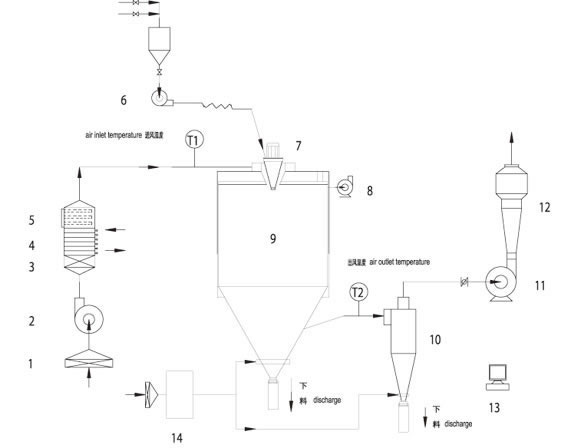 9. tour de séchage 10. cyclone 11. ventilateur de tirage 12. torchon d'eau 13. boîtier de commande 14. machine à déshumidifier et à réfrigérer |