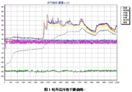 2)通过对比试验得到比较理想干花样品的干燥工艺为:预冻前用10%的柠檬酸无水乙醇溶液处理10min。冰箱慢冻4h,然后液氮速冻5min,升华干燥6h,然后解析干燥到结束。测得牡丹花在冻干过程中的温度﹑加热板温度﹑冷阱温度﹑物料重量以及真空度的变化,得到牡丹花的冻干曲线,为进一步研究牡丹花的干燥特性及干燥过程提供了理论依据。