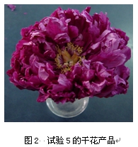 4)在试验5中,采用冰箱慢冻和液氮速冻相结合的预冻方式,并用含10%柠檬酸的无水乙醇溶液对牡丹花进行预处理,得到的牡丹花产品颜色和外观保持较好,在自然条件下储藏时间可达4个月以上。存在的问题是整个植株比较脆,很容易折断和破碎。建议对牡丹干花产品采取合适的方法进行软化,增加干花产品的韧性。