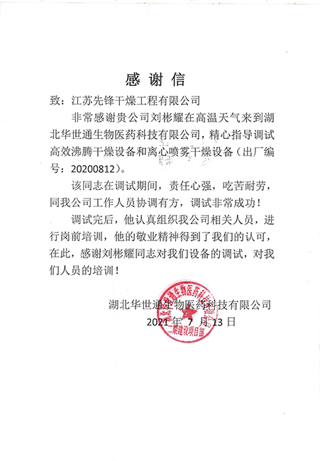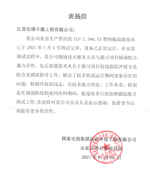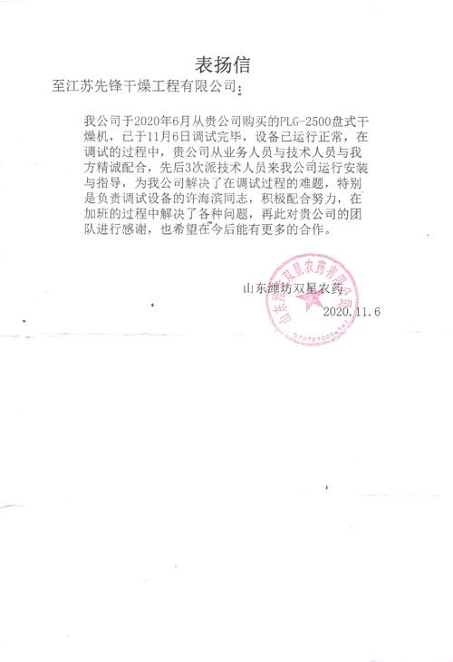• 河北建新化工盘式干燥机表扬信