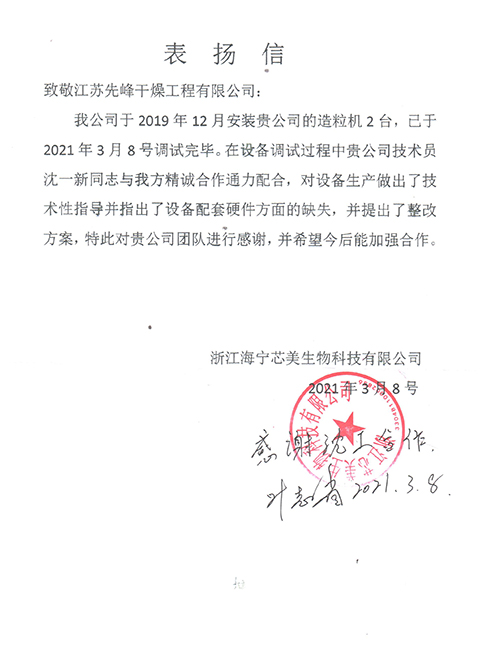 • 浙江海宁芯美生物科技表扬信