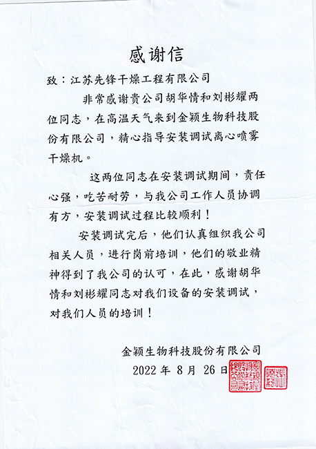 • 江苏碧升生物感谢信