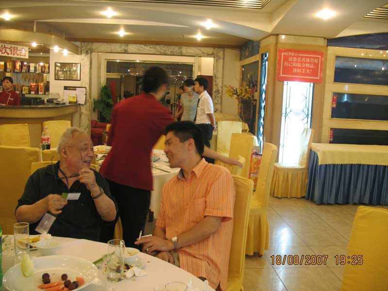 [答谢酒会上先锋公司总经理与老^、干燥^组顾问钱树德教授交谈]