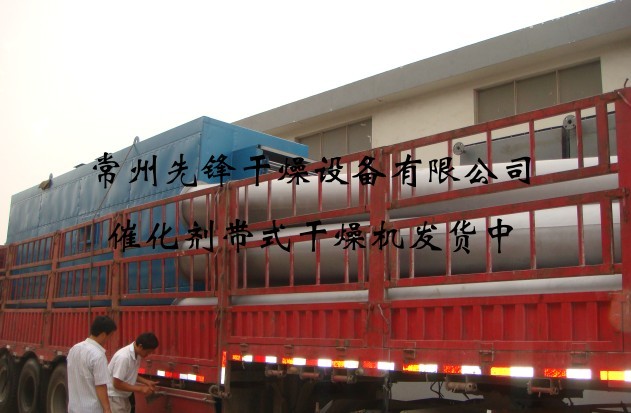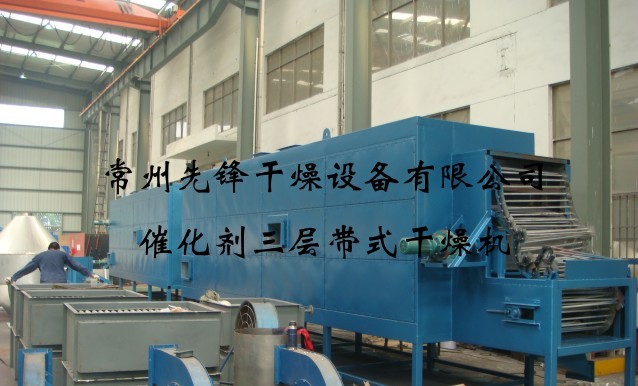 这台设备用于催化剂干燥,含水50%的催化剂经过挤条机挤条后,均匀落在网带上,环境空气经过过滤后,被蒸汽散热器加热至按工艺要求设定的温度,由中下层进入三层带式干燥机,中下层网带利用过的热风再经由循环风机循环给上层网带使用。空气的总体流向是由下向^动,和由上向下逐层运动的条状湿物料充分接触,完成干燥的传质传热的干燥过程。条状湿物料经三层带式干燥机干燥而成为含水约3%的干燥物料,整个系统的空气在干燥的过程中被两次利用,其热风分布的形式被设计为喷风管结构。