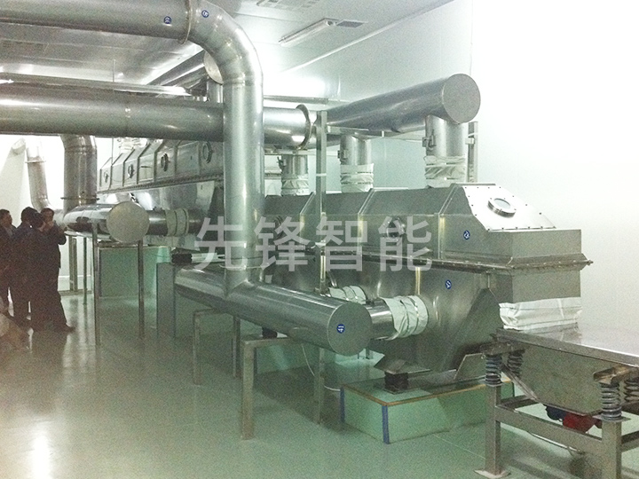★ 带式干燥机在鸡精生产中的应用: 设备特点:该设备为网带式干燥机,物料均匀铺布于网带上,伴随网带在干燥机体内运行,干燥过程中物料相对静止,不易出现散粉,使得成品颗粒得率有较大的提高。 应用条件:该设备较长,需要有足够的长度空间布置。为保证物料铺布均匀,与本干燥机配用的制粒机采用本公司设计制造的YK-160(200)×1200(1600)的特殊型长摇摆颗粒机,该制粒机将制粒与布料功能集为一体,减少物料的输送环节,使生产线紧凑合理。