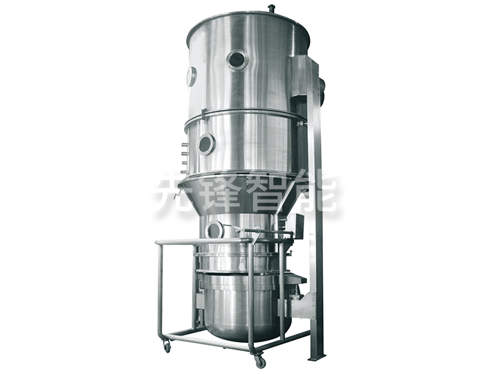 流化床分风板做成特殊环形片式结构,各片形成层叠形式,让气流从叶片的间隙通过,形成环流状的高速气流,从而使物料呈旋涡状似的规则运动,通过安装在侧壁的气动喷嘴将粘合剂或包衣液喷入规则流物料层,从而将粉体制成颗粒或得到连续均匀的膜衣。
